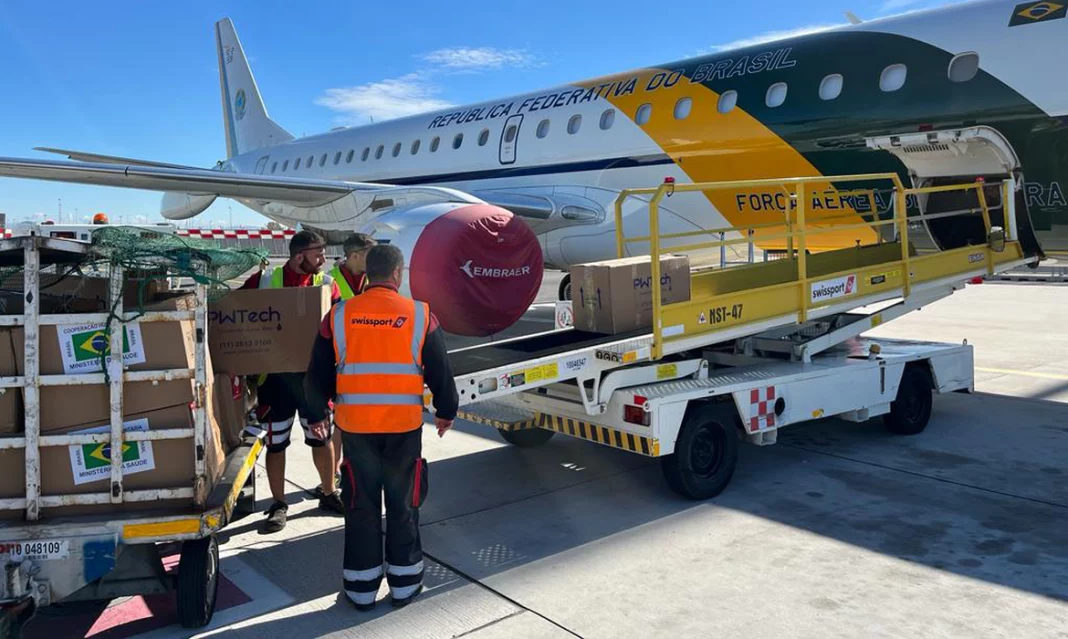 A aeronave também leva 40 purificadores de água portáteis, além de dois kits de medicamentos e insumos enviados pelo governo brasileiro, para atender à situação de emergência na Faixa de Gaza, que vem sendo bombardeada por Israel desde 7 de outubro.